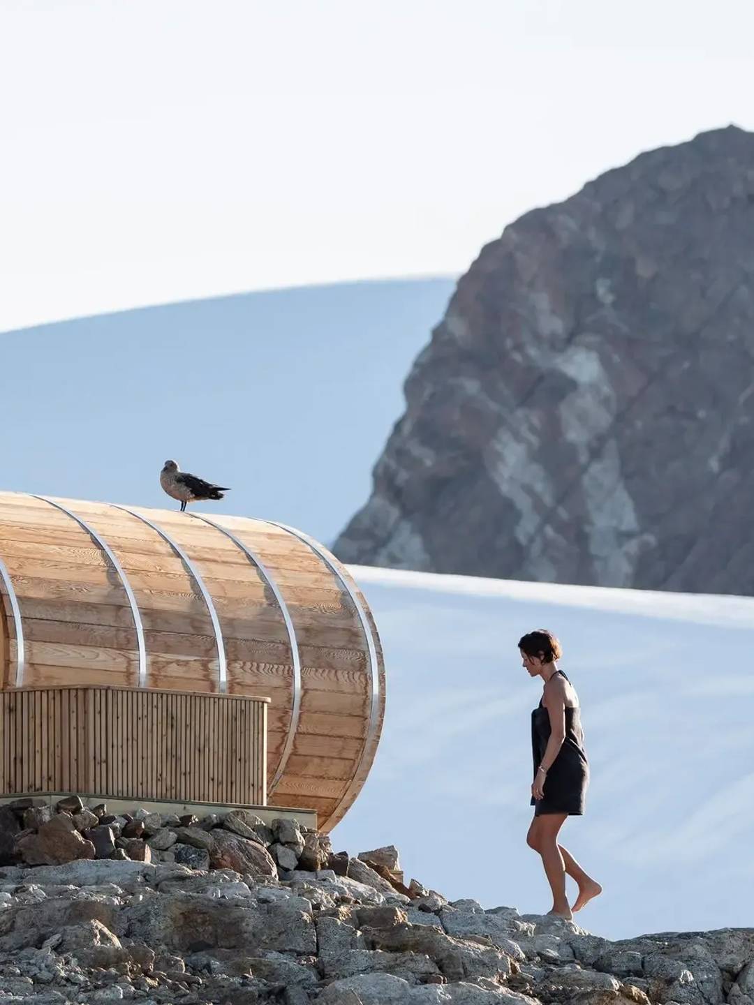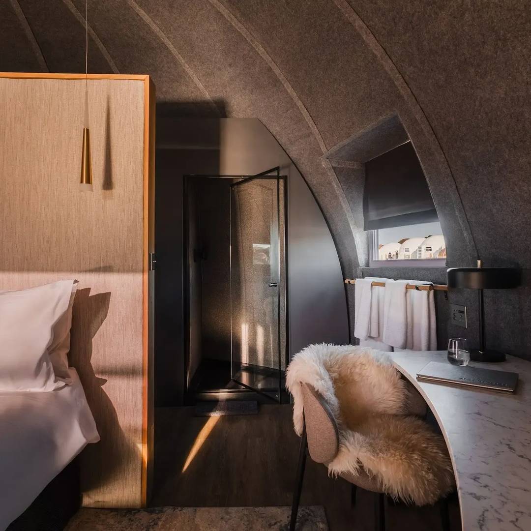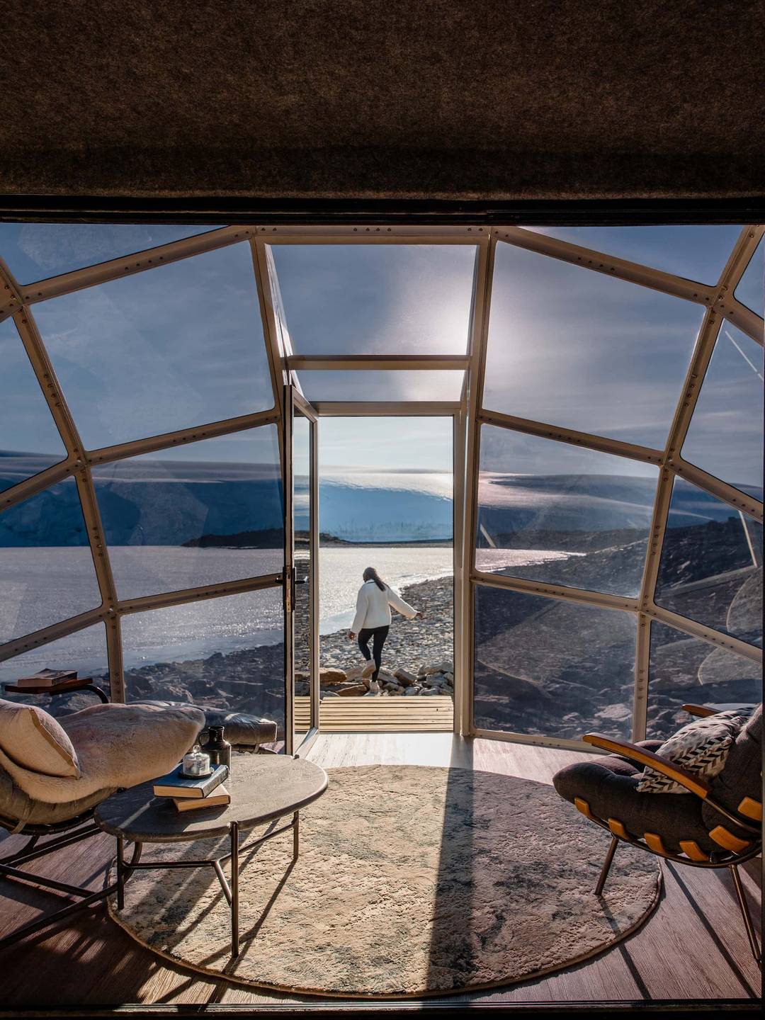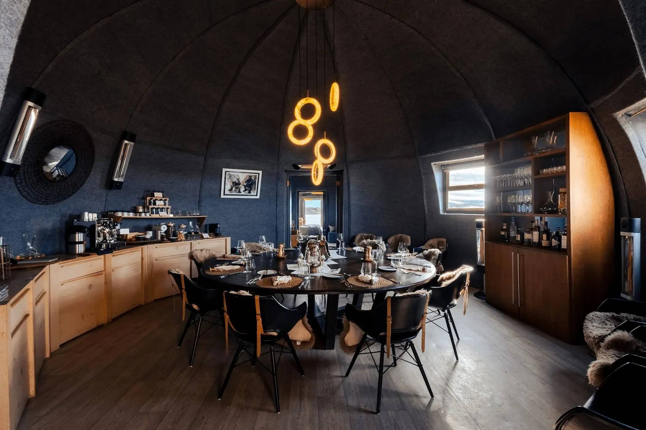 Whichaway Camp ressemble à une base polaire de haute couture, pensée pour disparaître dans le paysage. Les pods immaculés, aux lignes épurées, sont entièrement démontables et ne laissent aucune trace sur la glace. À l’intérieur, le contraste est saisissant : bois clair, matières nobles, lumière douce et atmosphère feutrée. Le confort est absolu, sans jamais voler la vedette à l’environnement. Le luxe se fait discret, respectueux, presque humble.